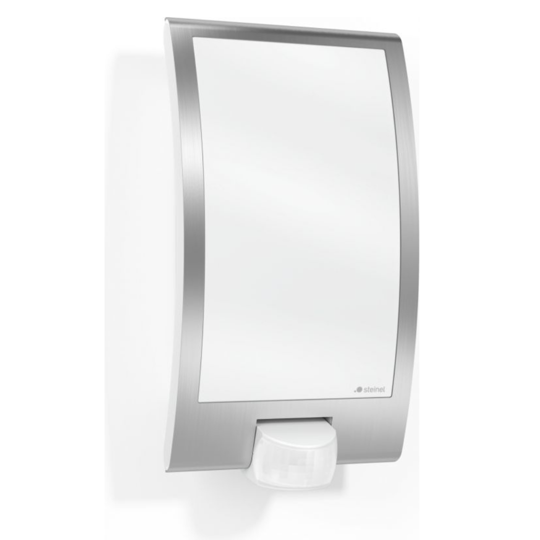 Āra sienas gaismeklis ar kustības sensoru, metāliska (inox), E27, maksimāla jauda līdz 60W, sensora attālums 10m un 180°, IP44, IK07, L 22 S, STEINEL