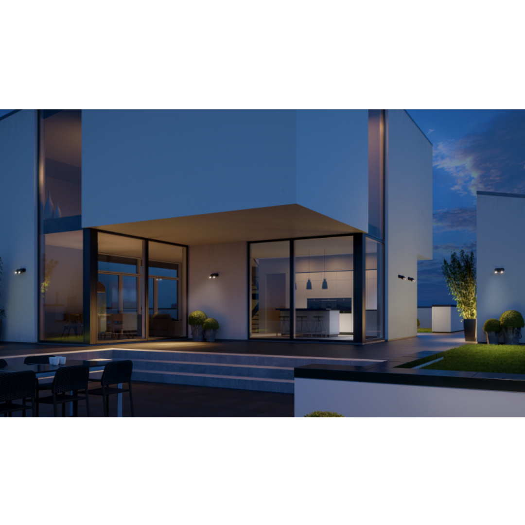 Āra sienas gaismeklis (spot) ar 2 kustības sensoriem, antracīts, 2xGU10, ar 2 spuldzem komplektā - 7.9W, 3000K, 2x512lm, IP44, sensoru attālums 10m un 90°, Spot DUO S, STEINEL