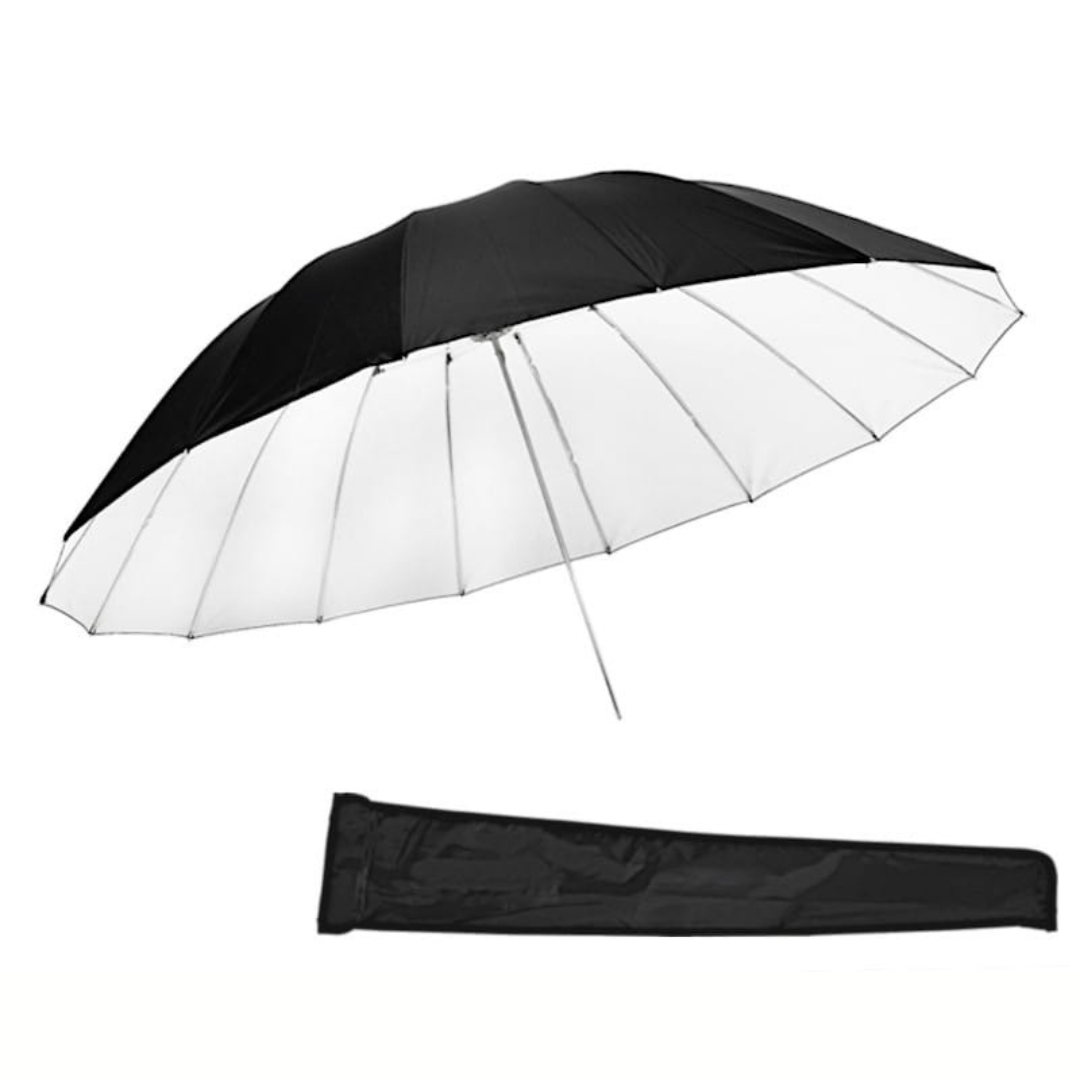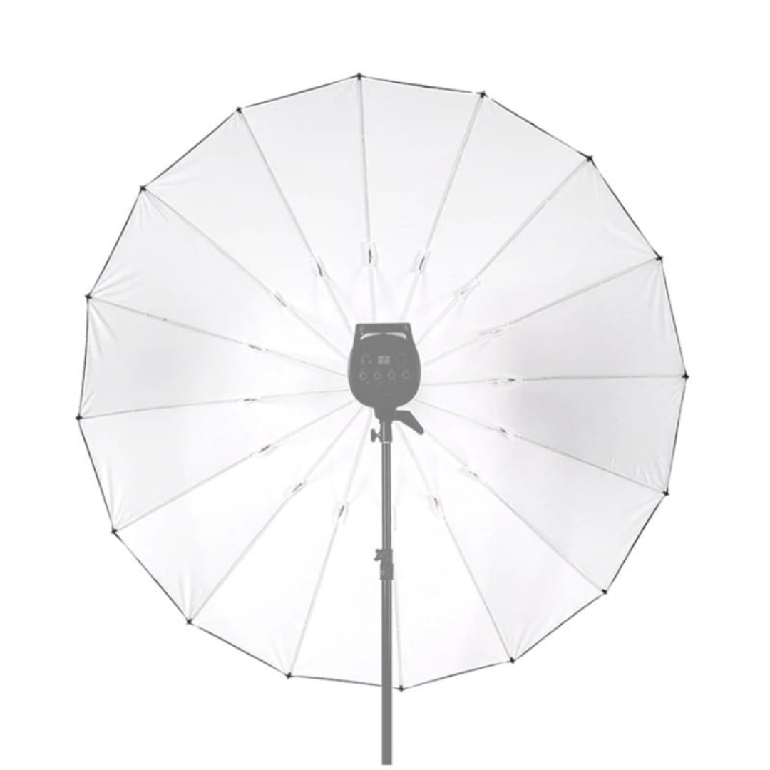 Liels MITOYA stikla šķiedras studijas atstarojošs lietussargs ar baltu iekšējo virsmu. Diametrs 185 cm ļaus jums veiksmīgi sakārtot fotoattēlu komplektu, pamatojoties uz vienu gaismas avotu. Lietussargs ir viens no pamata aprīkojuma elementiem fotostudijā. Tas nodrošina gaismas plūsmas atstarošanu un spēcīgu izkliedi pa ļoti lielu virsmu. Baltais materiāls padara gaismu ne tikai efektīvi izkliedētu, bet arī pievilcīgi maigu. Atstarojošā virsma ir arī krāsu neitrāla – tā neietekmē lampas gaismas krāsu temperatūru vai baltā balansu. Nojumes dziļums ir 50 cm.