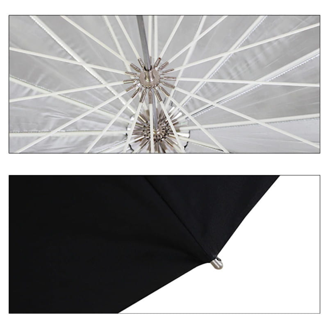 Augstas kvalitātes sudraba MITOYA stikla šķiedras atstarojošs lietussargs ar diametru 185 cm. Būtisks aprīkojums katrai fotostudijai, kas ļauj atstarot un izkliedēt gaismas plūsmu pa ļoti lielu virsmu. Sudraba atstarojošā virsma ļauj iegūt kontrastējošu gaismu, izvelkot un izceļot detaļas. Šī iemesla dēļ tas vislabāk darbojas modes, produktu vai reklāmas fotogrāfijās. Virsma ir arī krāsu neitrāla – tas neietekmē lampas gaismas krāsu temperatūru vai baltā balansu. Nojumes dziļums ir 50 cm.