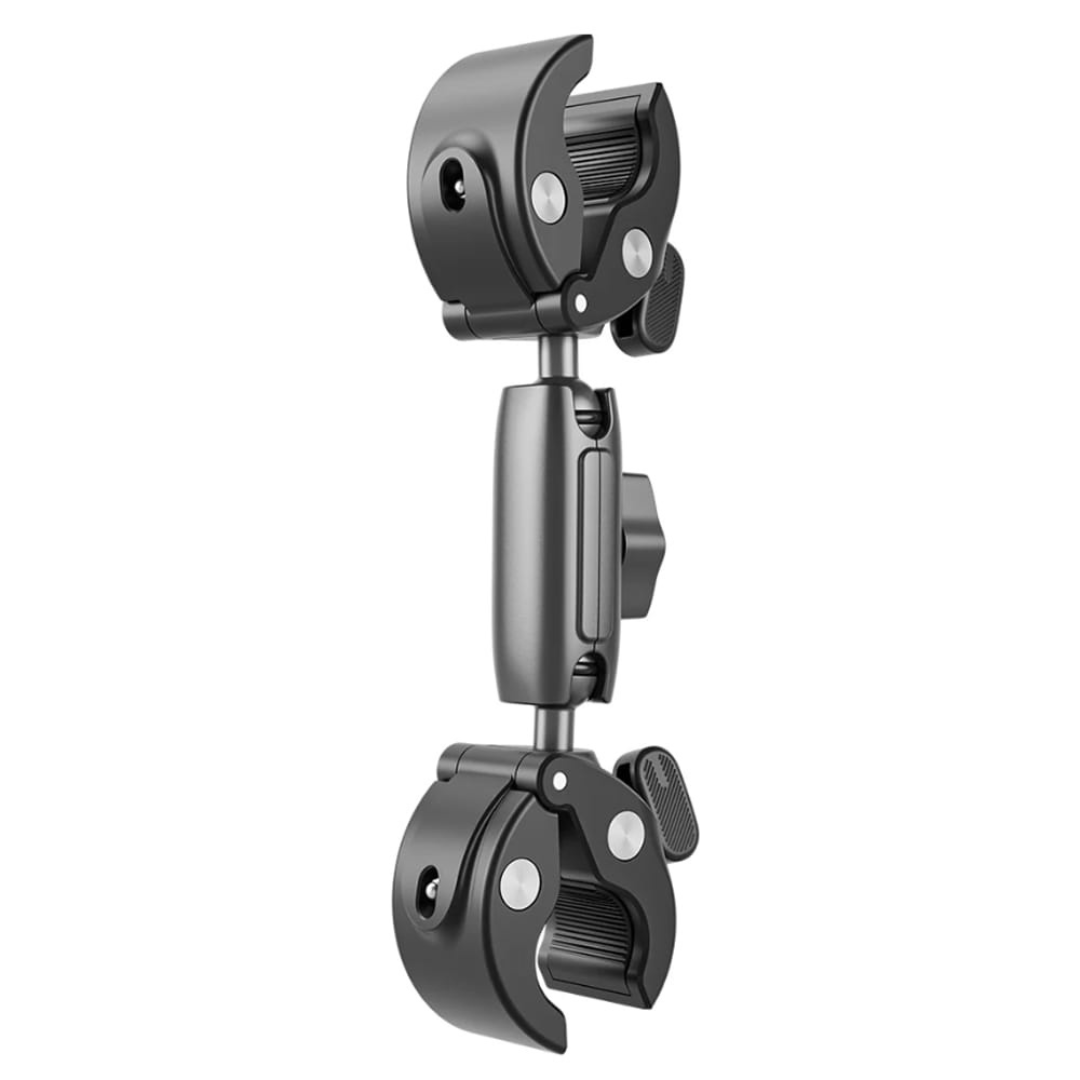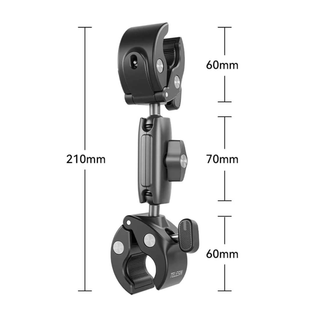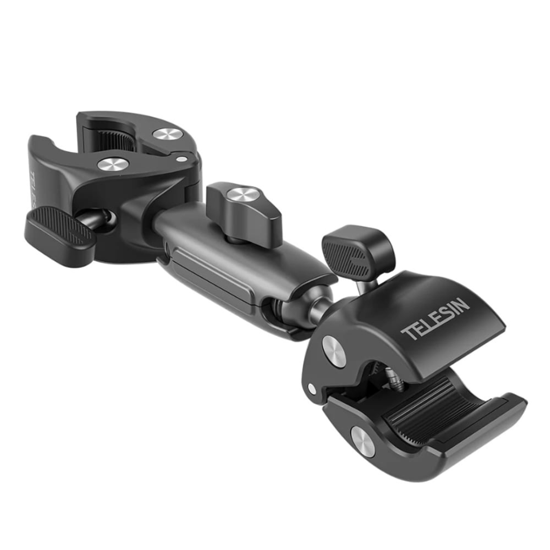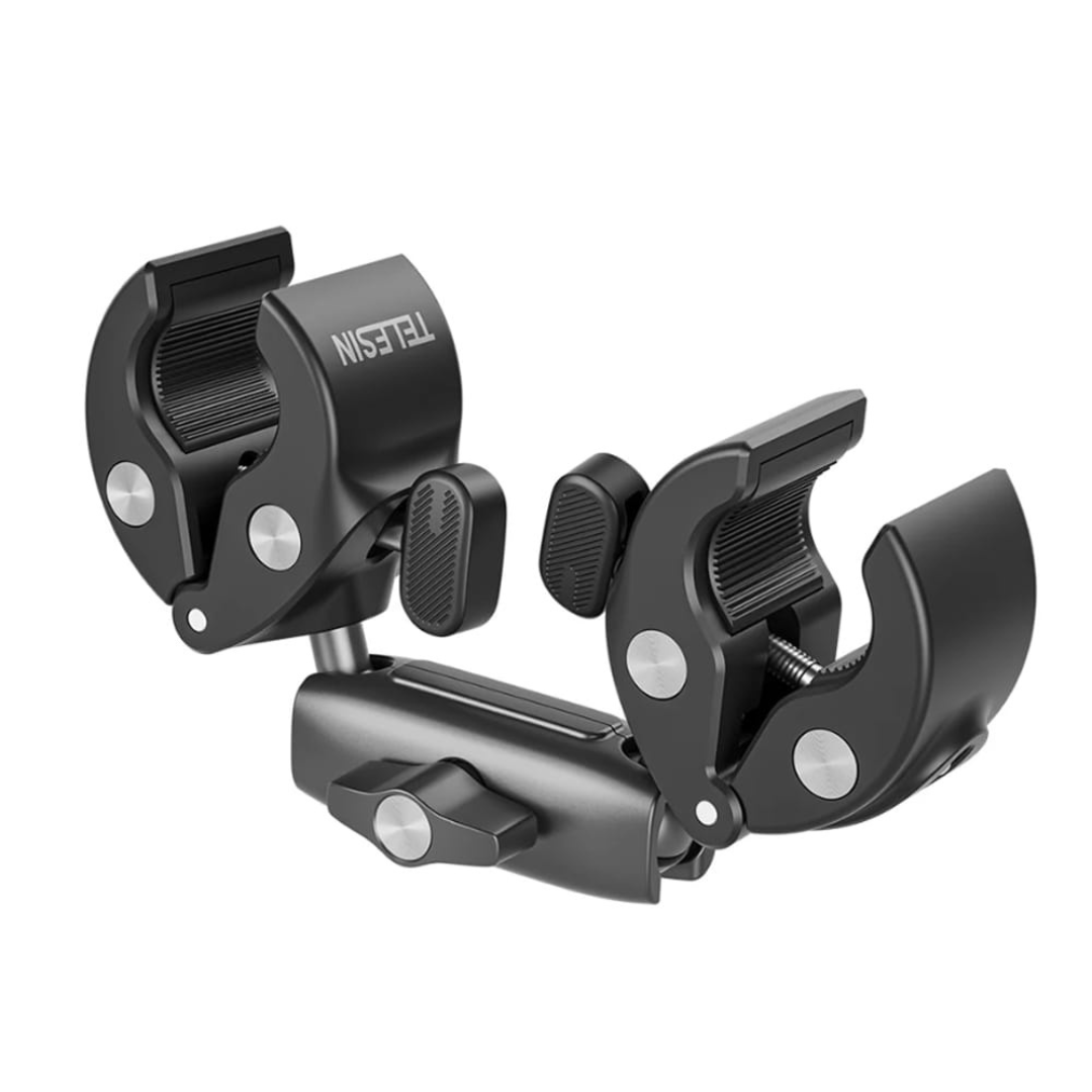 Telesin GP-HBM-001-D ir daudzfunkcionāls stiprinājuma kronšteins dubultā krabja skavas formā. Paredzēts, lai atvieglotu darbu pie filmu komplektiem neparastos interjeros vai atklātās vietās. To var uzstādīt uz caurulēm ar diametru no 9 līdz 38 mm, padarot to par universālu risinājumu velosipēdistiem, motociklistiem un statīvu un citu konstrukcijas elementu lietotājiem. Komplektā ietilpst noņemami spilventiņi, kas ierobežo žokļa darbību attiecīgi diapazonā no 9-15 mm un 22-38 mm. Rokturis ļauj vienmērīgi mainīt katra žokļa pozīciju un pagriezt 360°. Cietā alumīnija un plastmasas konstrukcija garantē izturību pret mehāniskiem bojājumiem, savukārt pretslīdes slāņi nodrošina stabilu un spēcīgu saķeri.