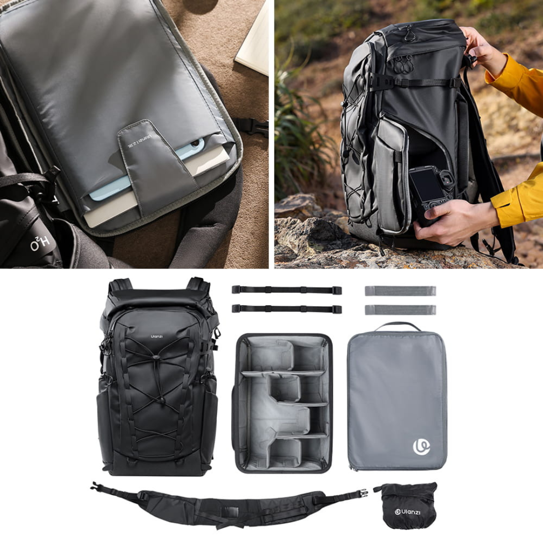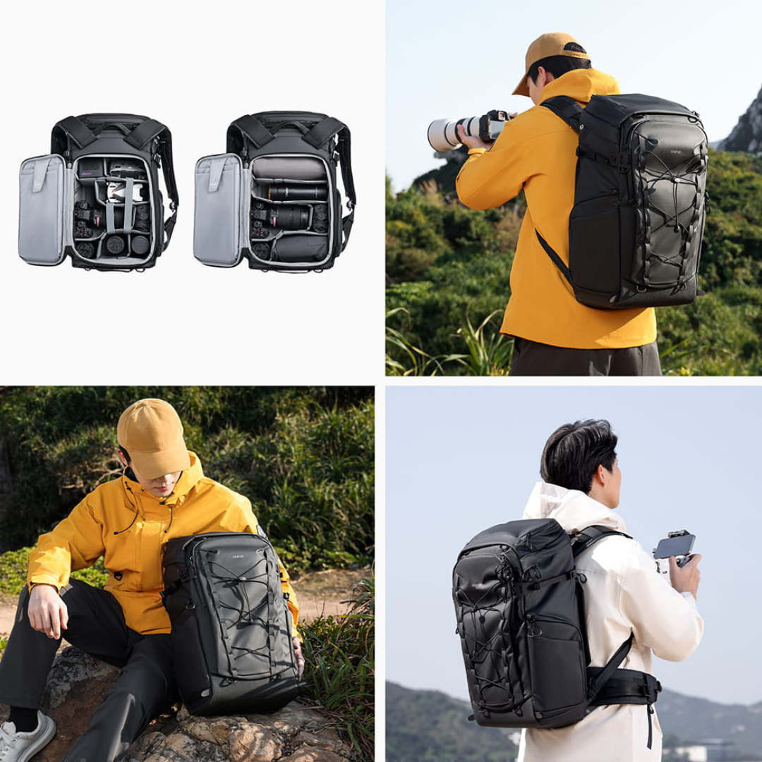 Ulanzi AB01 ir ārkārtīgi ietilpīga un daudzpusīga fotografēšanas mugursoma, kas izstrādāta, domājot par foto un video operatoriem, īpaši tiem, kas specializējas ainavu un dabas fotografēšanā. Izgatavota no ūdensnecaurlaidīga poliestera, tā piedāvā pilnīgu aizsardzību jūsu aprīkojumam visos lauka apstākļos. Vienas nodalījuma iekšpusē ir noņemams kameras kuba ieliktnis ar vairākām starpsienām, kas ļauj elastīgi izlietot vietu. Mugursomā ērti var ievietot kameru ar objektīvu komplektu, 16 collu klēpjdatoru, 11 collu planšetdatoru, papildu piederumus un personīgās mantas. Tilpums: 38 litri.