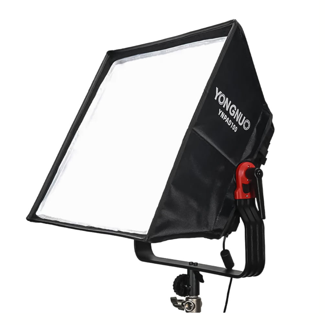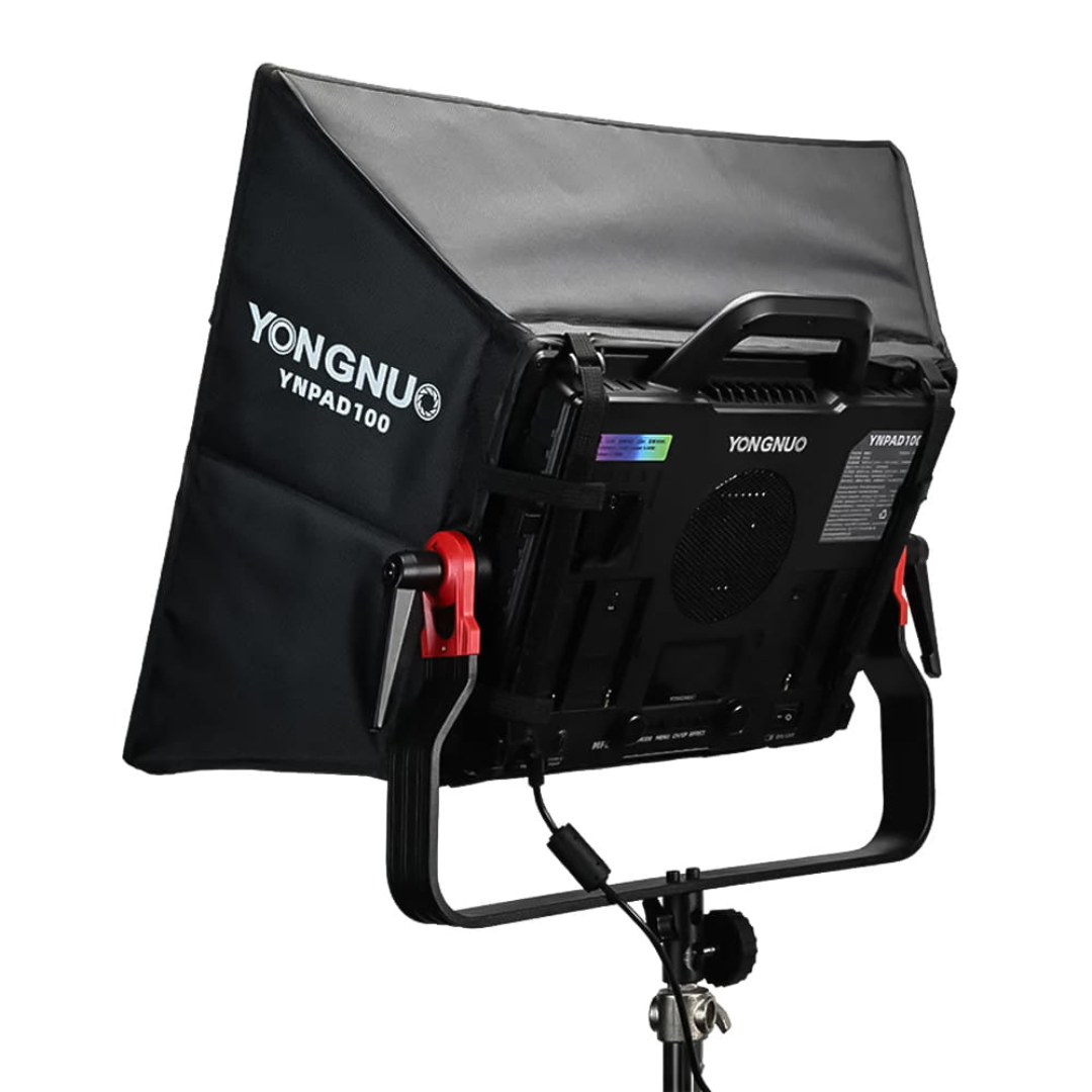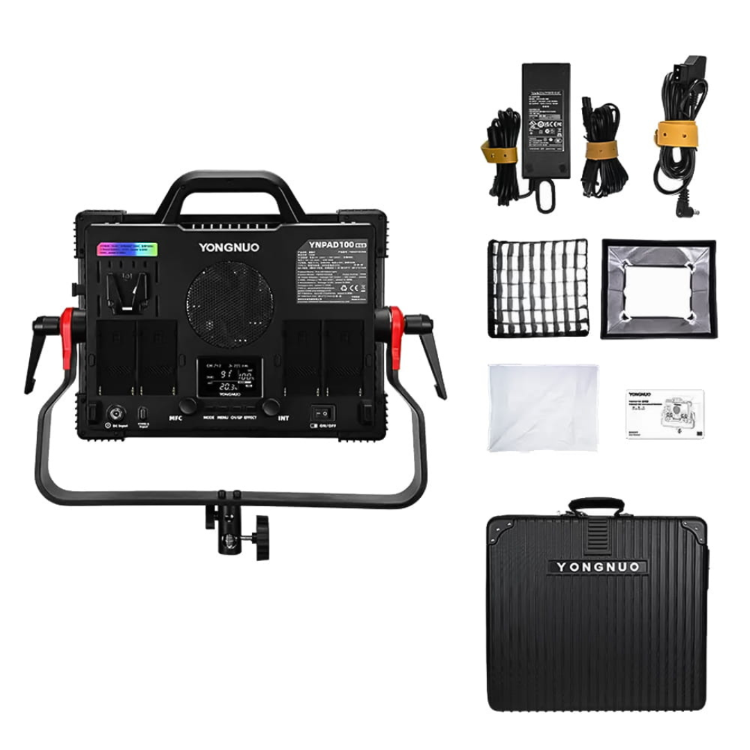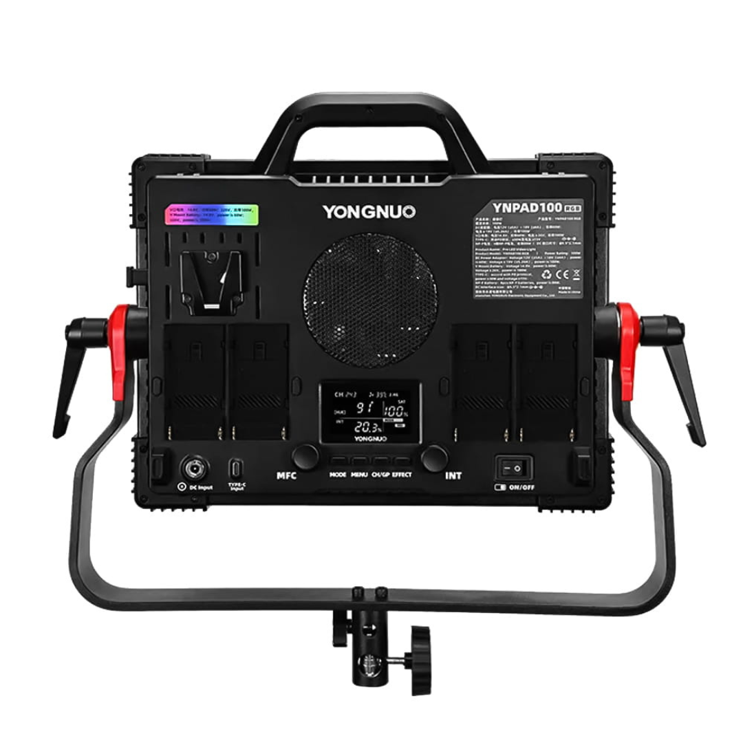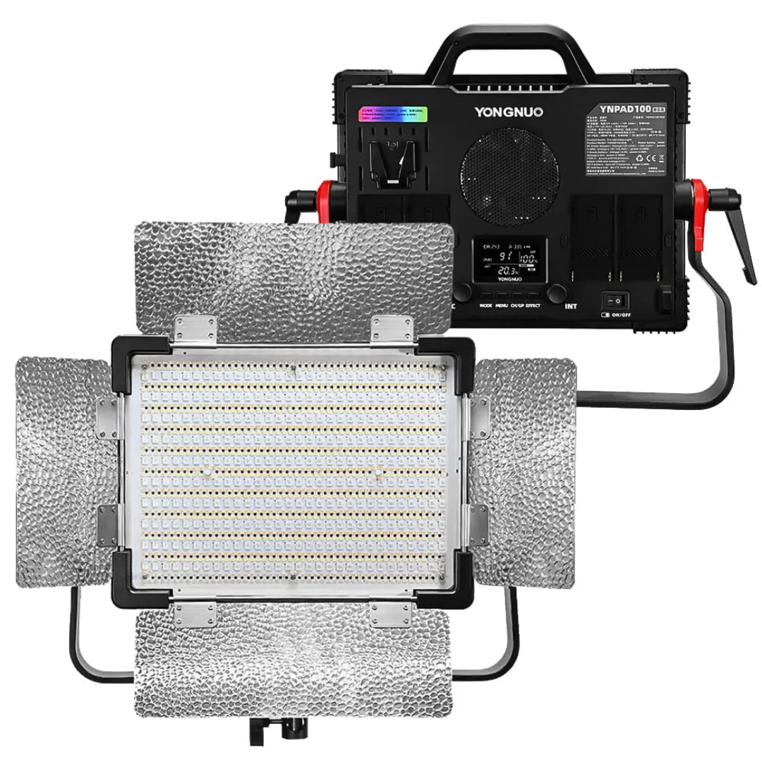 YNPAD100 RGB lampu var darbināt 4 veidos: no tīkla (iekļauts 19 V 6,3 A tīkla adapteris), izmantojot četras NP-F baterijas, vienu V-lock akumulatoru, kā arī ar barošanas avotu vai pietiekami efektīvu barošanas bloku, kas savienots ar USB-C portu (baterijas, barošanas banka un USB-C barošanas avots komplektā neietilpst). Lampa ir uzstādīta U veida statīva turētājā , kas ļauj brīvi mainīt tā slīpuma leņķi. Tam ir arī profilēts caurums fotogrāfiskajam lietussargam. Uzstadama uz statīva ar 16 mm tapu. Regulējamas šķūņa durvis ļauj precīzi kontrolēt gaismas jaudu – YNPAD100 var izgaismot visu komplektu vai darboties kā pretgaisma. Komplektā ietilpst arī neliels softbox ar režģi un stingrā pārnēsāšanas soma.