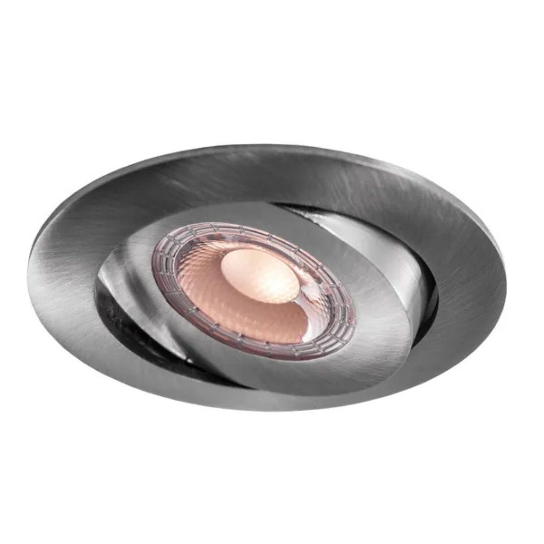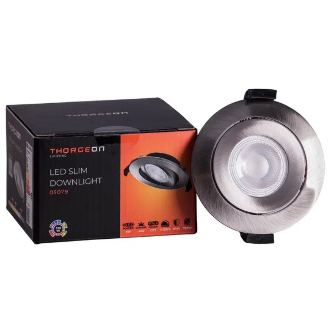 Gaismeklis LED, iebūvējams, plāns, matēts niķelis, 5W, 3000K/4000K/5700K, 400Lm, IP44, 50°, CRI>90, dimmējama, 70-75mm cauruma diametrs, ar iekšējo draiveri, THORGEON