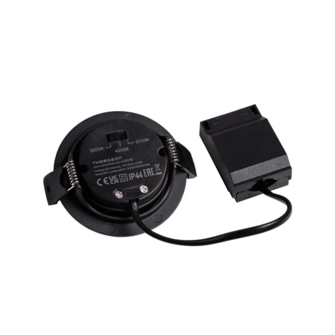 Gaismeklis LED, iebūvējams, plāns, melns, 5W, 3000K/4000K/5700K, 400Lm, IP44, 50°, CRI>90, dimmējama, 70-75mm cauruma diametrs, ar iekšējo draiveri, THORGEON