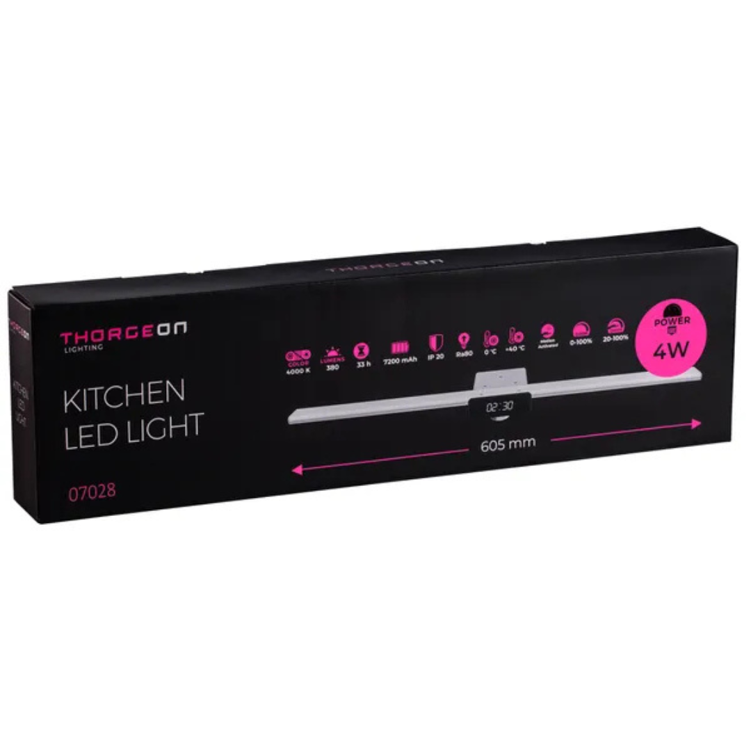 Gaismeklis LED zem virtuves skapja vai plaukta, 4W, 4000K, ar akumulatoru 7200mAh, 600mm, ar pulksteni, var regulēt spožumu, THORGEON