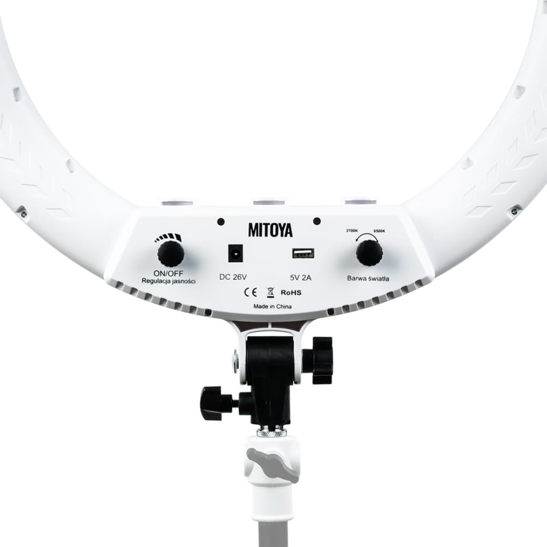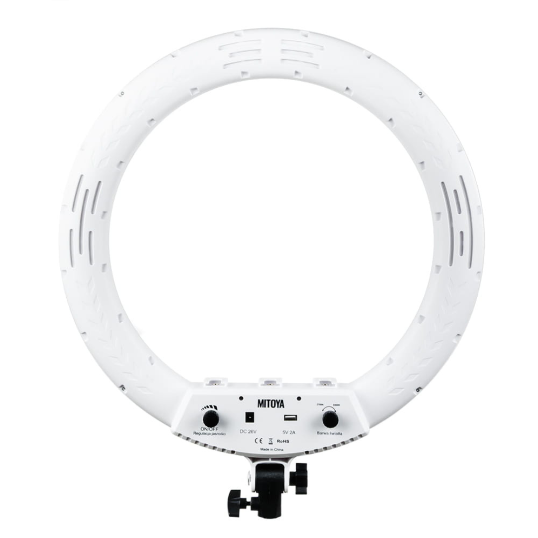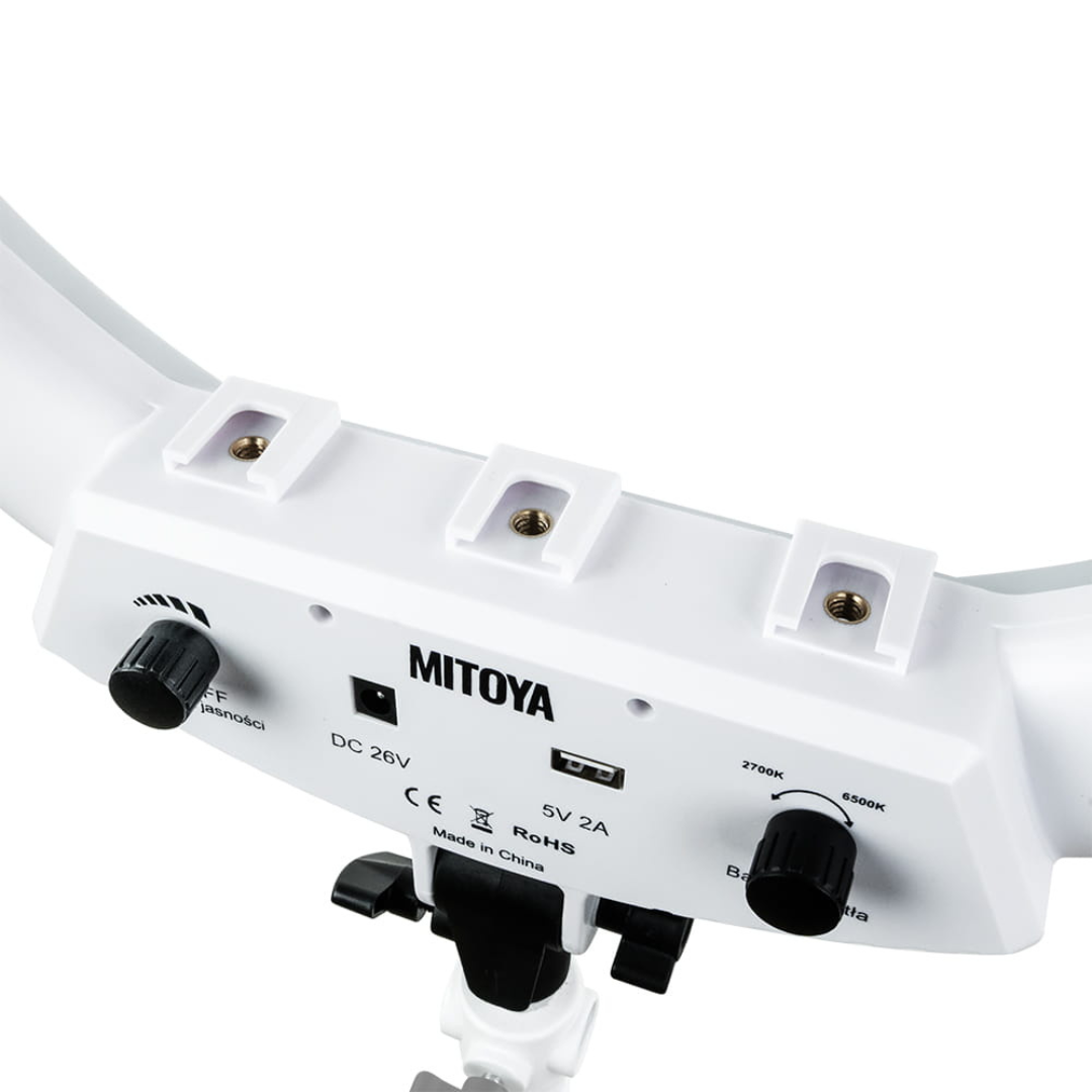 MITOYA MTY18C WHITE LED RING gredzenveida lampas diametrs ir 45 cm, un tai ir vienmērīga gaismas jaudas un krāsu temperatūras regulēšana no siltas 2700 K līdz vēsai 6500 K. Tā nodrošina spēcīgu, izkliedētu gaismu, kas ir ideāli piemērota grimam un skaistumkopšanas procedūrām. Komplektā iekļautais elastīgais tālruņa turētājs ļauj viedtālruni uzstādīt vertikāli vai horizontāli. Iebūvētais USB ports ļauj uzlādēt tālruni ilgstošas lietošanas laikā. Visu gredzenu var noliekt uz priekšu un atpakaļ par 90°. Lampai ir balts korpus.