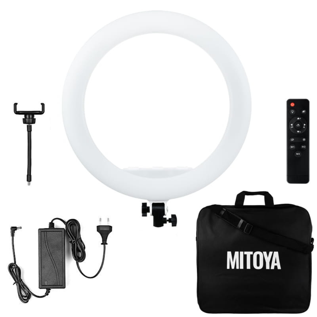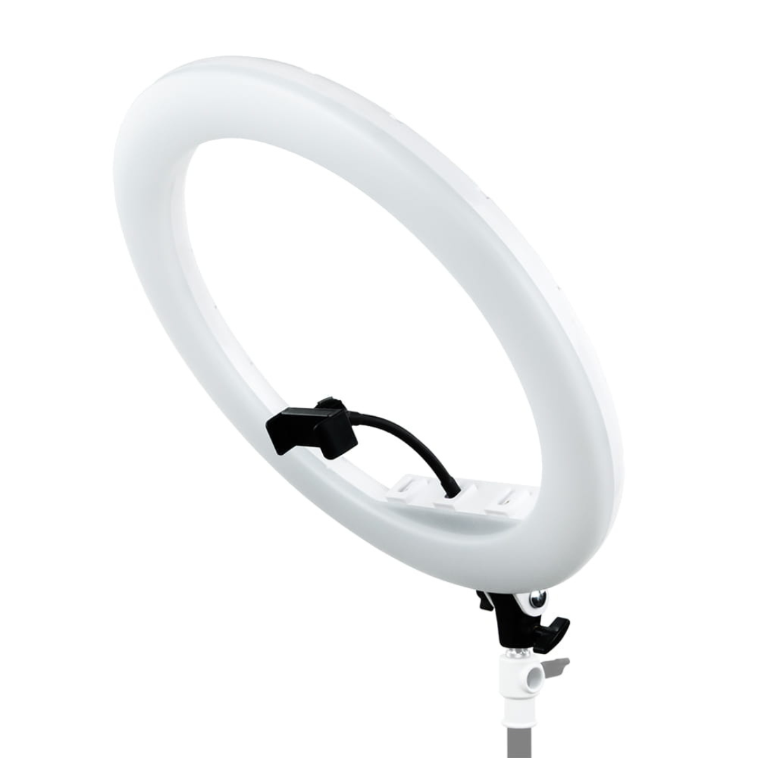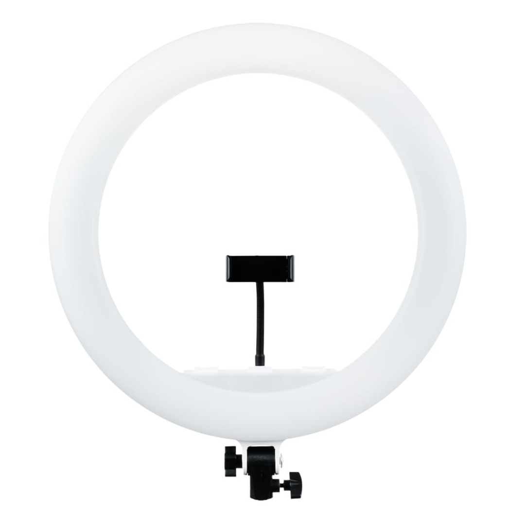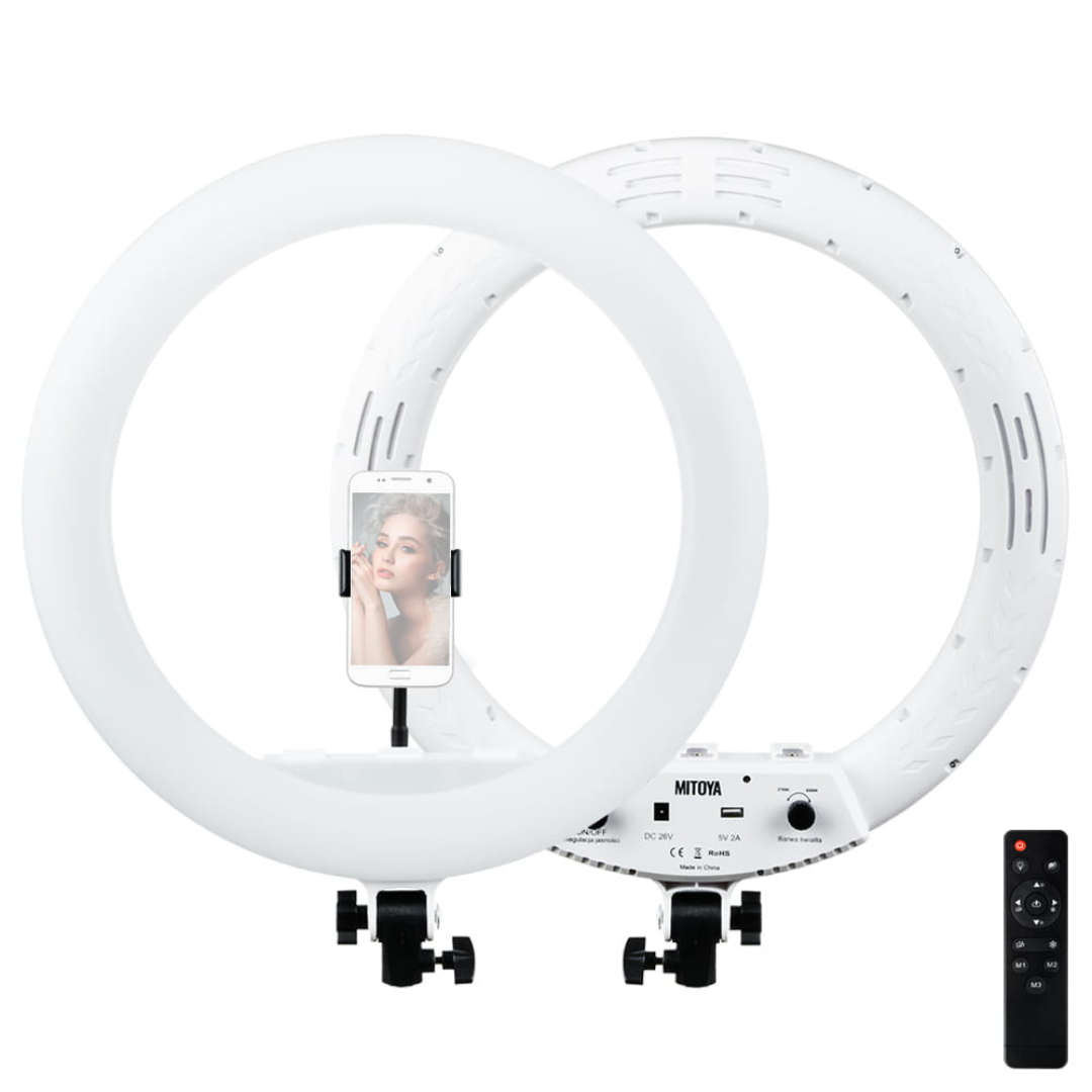 MITOYA MTY18C WHITE LED RING gredzenveida lampas diametrs ir 45 cm, un tai ir vienmērīga gaismas jaudas un krāsu temperatūras regulēšana no siltas 2700 K līdz vēsai 6500 K. Tā nodrošina spēcīgu, izkliedētu gaismu, kas ir ideāli piemērota grimam un skaistumkopšanas procedūrām. Komplektā iekļautais elastīgais tālruņa turētājs ļauj viedtālruni uzstādīt vertikāli vai horizontāli. Iebūvētais USB ports ļauj uzlādēt tālruni ilgstošas lietošanas laikā. Visu gredzenu var noliekt uz priekšu un atpakaļ par 90°. Lampai ir balts korpus.