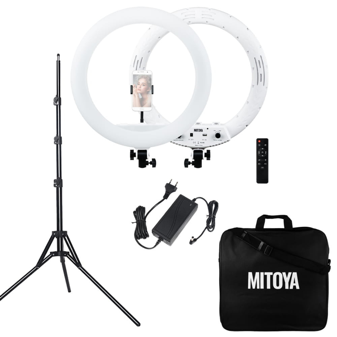 LED gredzena lampa MITOYA, komplekts, MTY18C BALTA 45cm + F200 statīvs