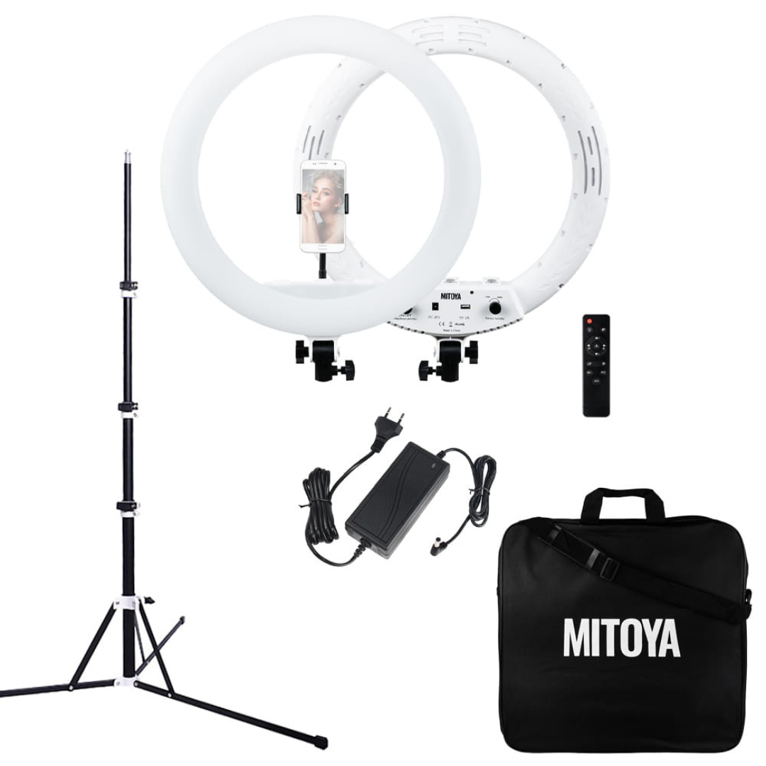 MITOYA MTY18C WHITE LED RING gredzenveida lampas diametrs ir 45 cm, un tai ir vienmērīga gaismas jaudas un krāsu temperatūras regulēšana no siltas 2700 K līdz vēsai 6500 K. Tā nodrošina spēcīgu, izkliedētu gaismu, kas ir ideāli piemērota grimam un skaistumkopšanas procedūrām. Komplektā iekļautais elastīgais tālruņa turētājs ļauj viedtālruni uzstādīt vertikāli vai horizontāli. Iebūvētais USB ports ļauj uzlādēt tālruni ilgstošas lietošanas laikā. Visu gredzenu var noliekt uz priekšu un atpakaļ par 90°. Lampai ir balts korpus.