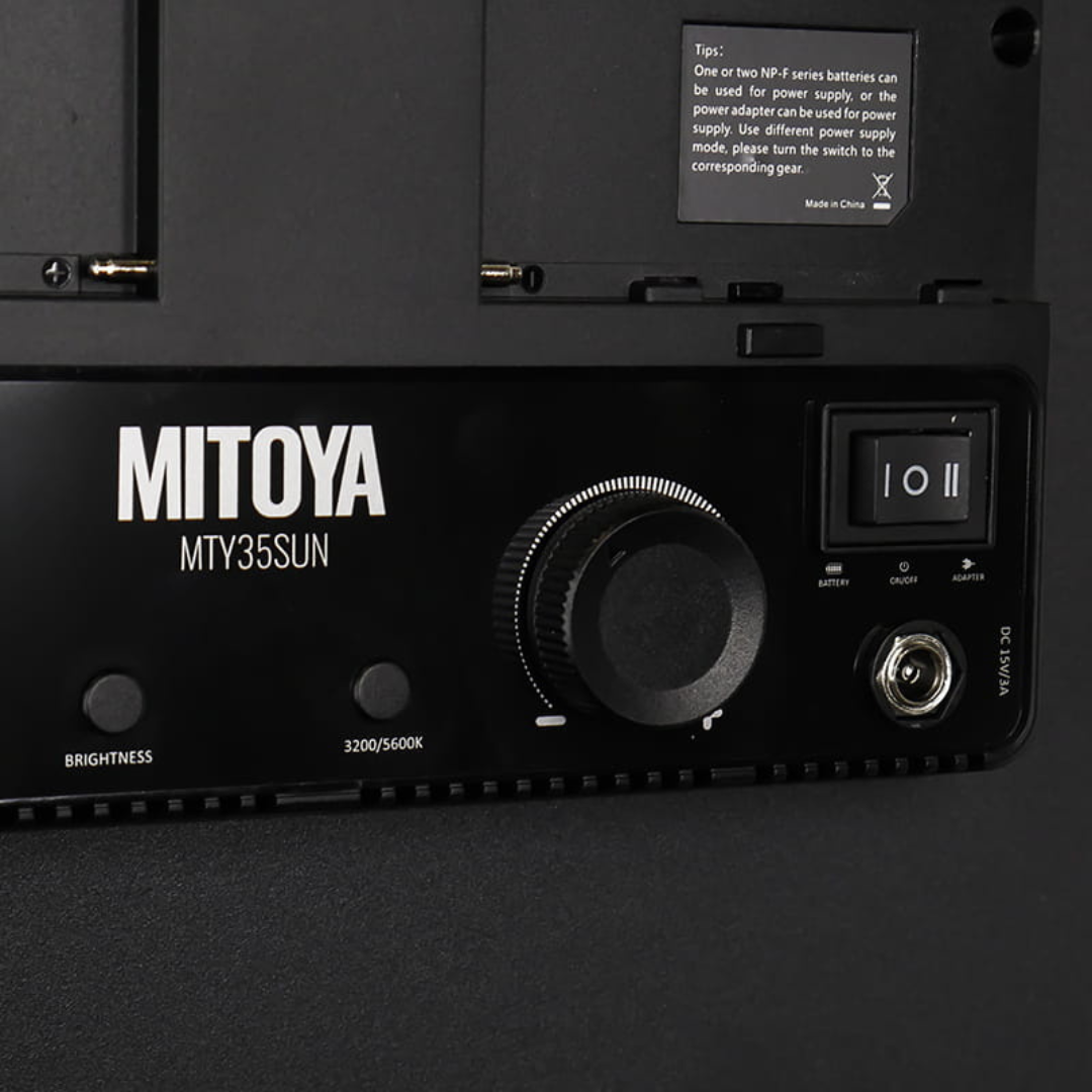 MITOYA SUN35 ir lampa ar regulējamu jaudu un krāsu temperatūru no 3200 līdz 5600 K. Apļveida panelis sastāv no 272 gaismas diodēm, no kurām puse izstaro siltu gaismu, bet otra puse vēsu (neitrāli baltu). Krāsu temperatūra ir regulējama ar 100 K soli un gaismas jauda ar 1% soli, lai Jūs varētu viegli noteikt vislabvēlīgākos darbības parametrus. Lampa patiesi atveido krāsas – tās CRI indekss ir 95+.