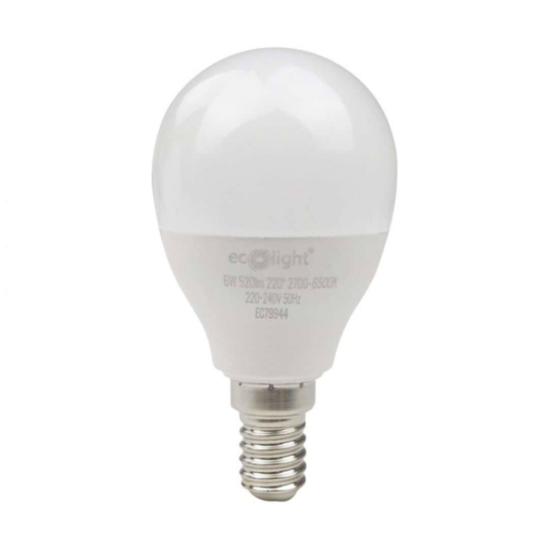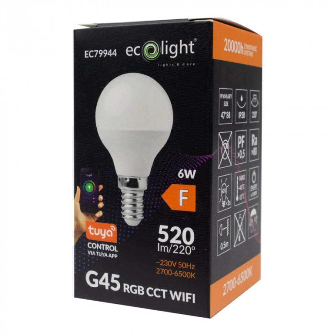 LED spuldze 6W, E14, G45, 520Lm, 2700-6500K + RGB, 220-240V AC, WiFi, ar vadības iespēju no telefona - Tuya, ECOLIGHT