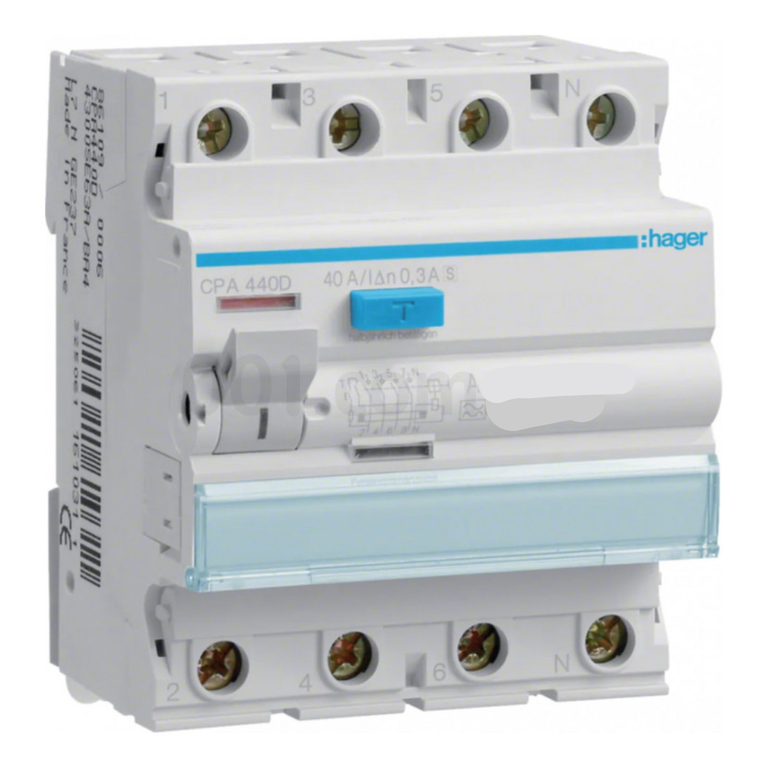 Noplūdes strāvas slēdzis 4P 40A 300mA, A type, S (selective), HAGER