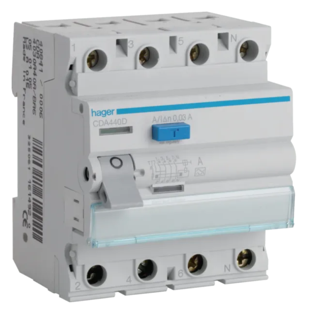 Noplūdes strāvas slēdzis 4P 40A 30mA, A type, HAGER