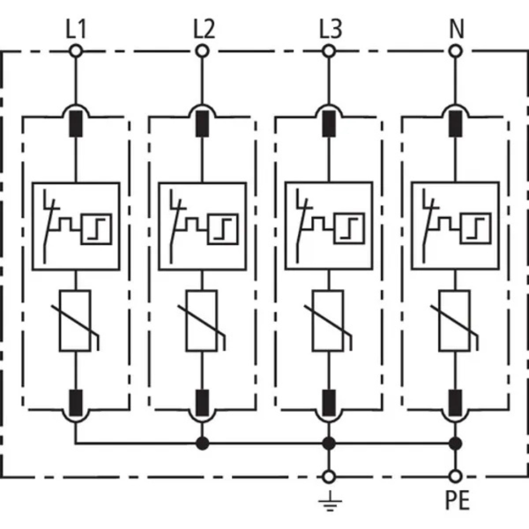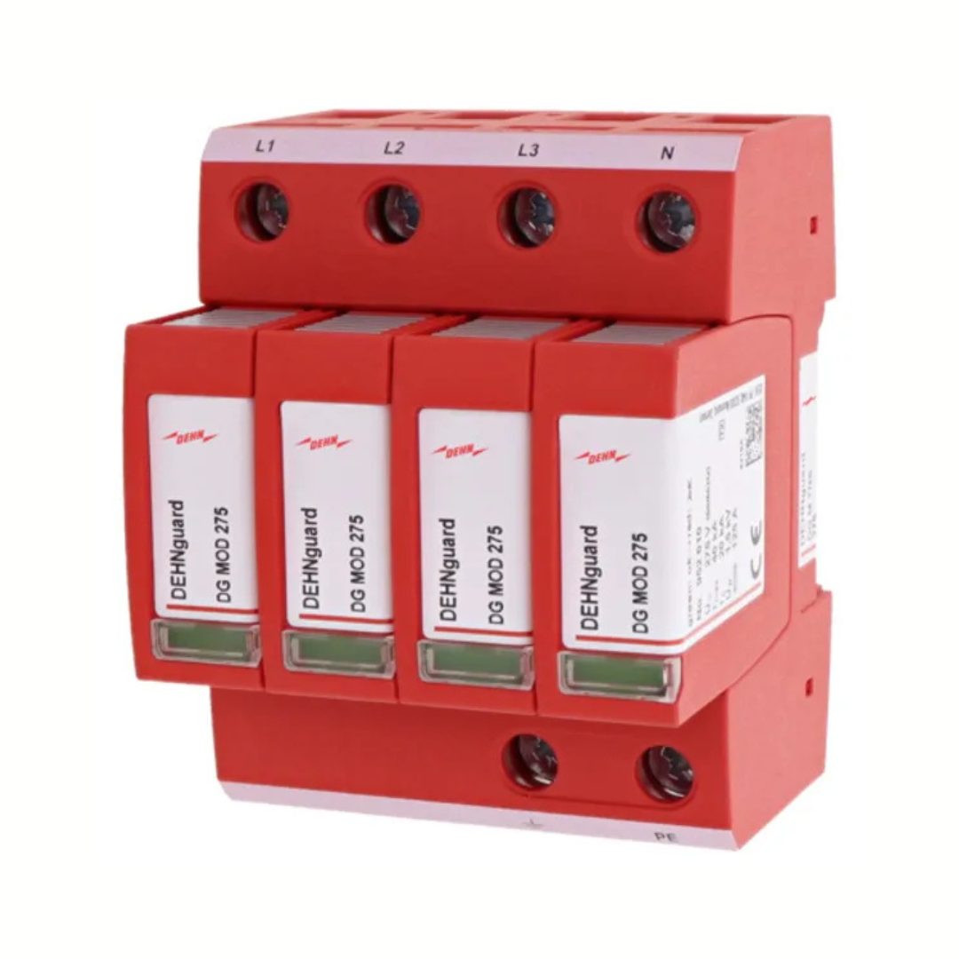 Daudzpolu DEHNguard M pārsprieguma ierobežotājs (2. tips saskaņā ar EN 61643-11), kas sastāv no pamatdaļas un spraudkontakta aizsardzības moduļiem. Augsta uzticamība, pateicoties Thermo Dynamic Control SPD uzraudzības ierīcei.
