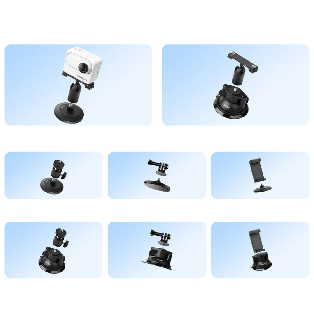 Montāžas pamatnē ir izmantoti spēcīgi neodīma magnēti, un piesūceknim ir viegli lietojams un ērts bloķēšanas mehānisms, kas samazina nejaušas atdalīšanās risku. Abiem piederumiem ir standarta 1/4" vītne, kas padara tos saderīgus ar plašu ierīču un citu piederumu klāstu, piemēram, tālruņu turētājiem, lodīšu galviņām un mazām LED lampām.