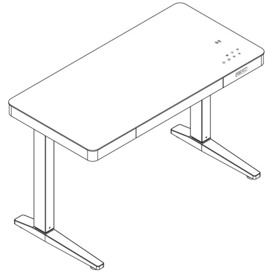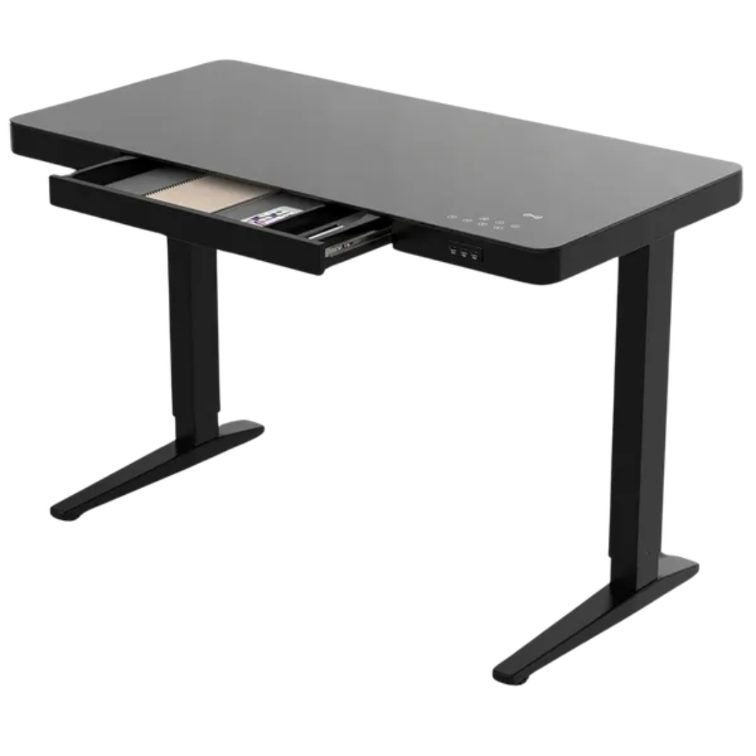Melns darba galds, augstumā regulējams, galda virsma ar metāla rāmi un 6 mm rūdītu stiklu. Dubulta motoru sistēma.