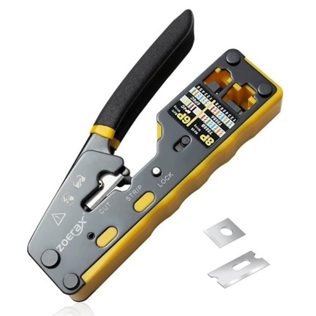 Funkcijas: kabeļu izolācijas noņemšana, kabeļu griešana, 8P/6P kontaktu krimpošana, atbrīvošanas/bloķēšanas rokturis.