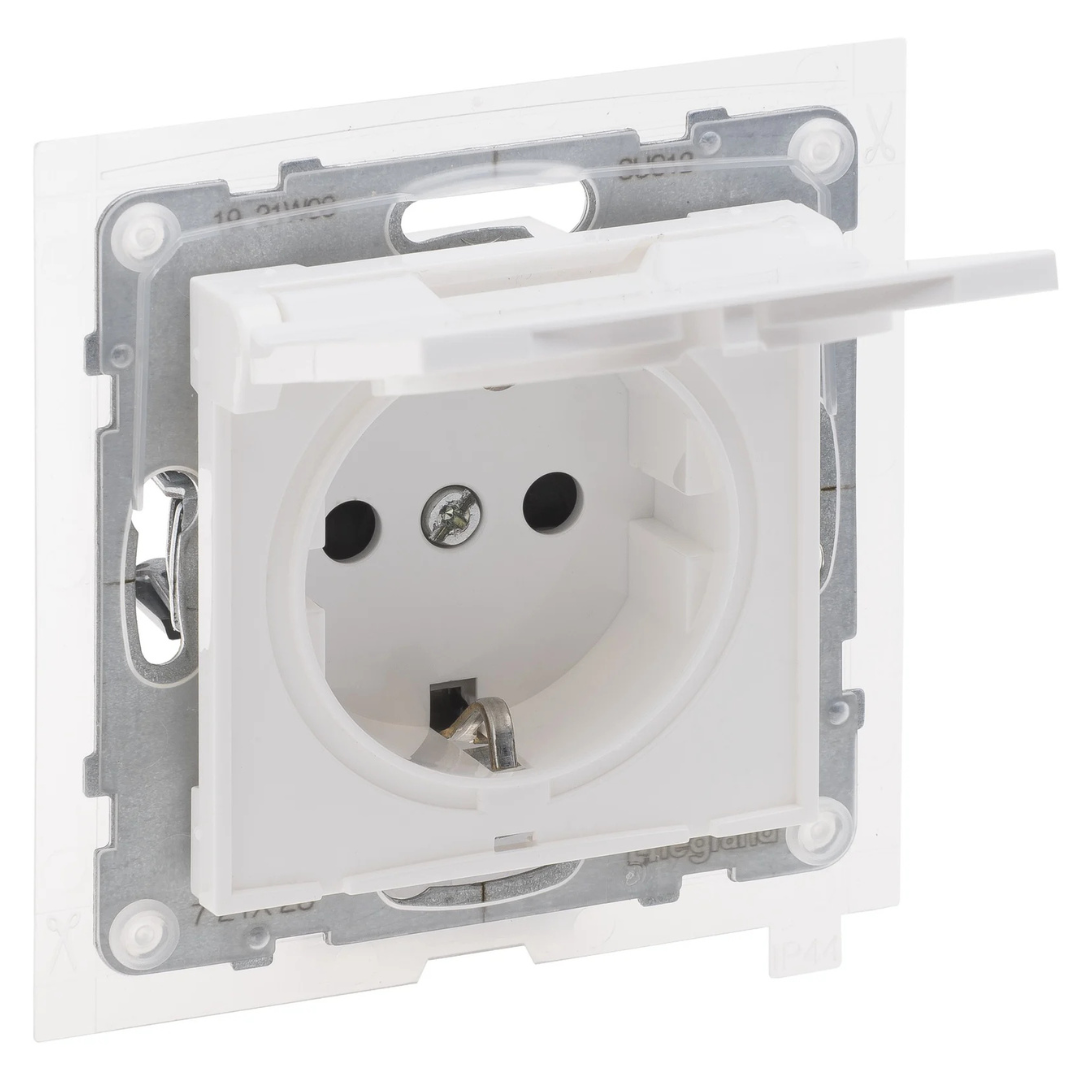Rozete ar zemējumu, 16A , ar bērnu aizsardzību un vāciņu IP44, balta, SUNO