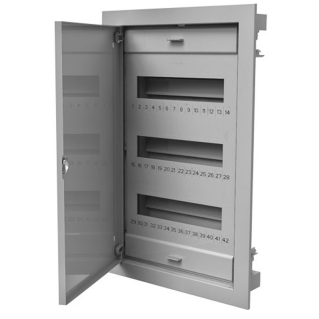 Sadales skapis zemapmetuma 36+6 mod., ar metāla durvim un klemmem N+PE, ar stiprinājumiem reģipsī, IP40, Pawbol