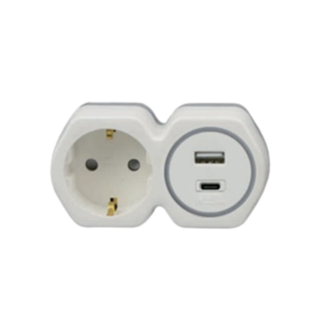 Sadalītājs 1-vietīgs ar bērnu aizsardzību 16A 250V + USB lādētājs (Type A + Type C) 2.4A, balts