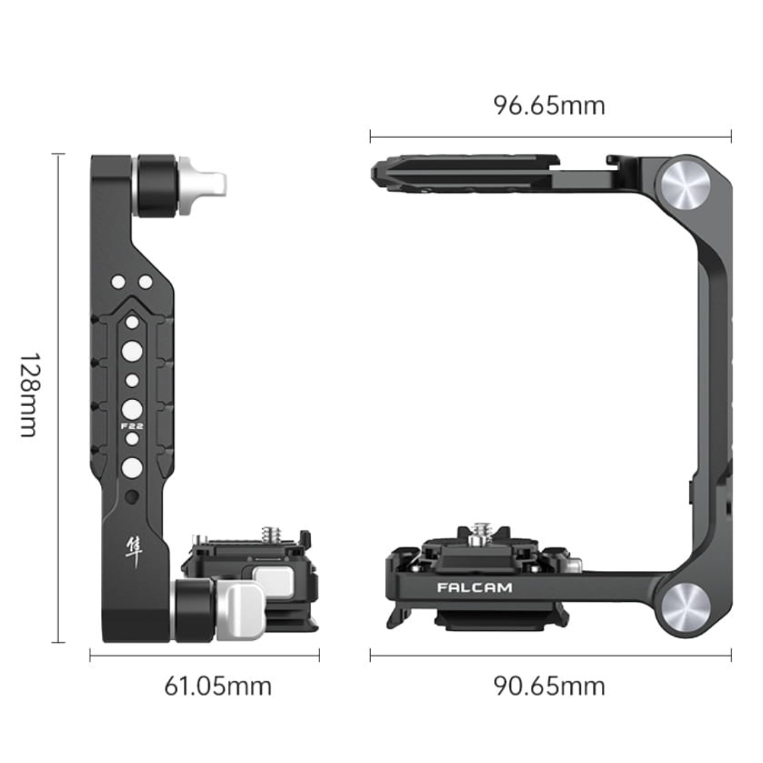 Universāls Ulanzi × FALCAM kameras pusbūris, kas aprīkots ar Quick Release F22 stiprinājumiem. Tas ļauj uzstādīt ārējos stiprinājumus – rokturus, sānu rokturus, galviņas un burvju rokas, kā arī priekšskatījuma monitorus, LED lampas un ārējos mikrofonus. Aprīkots ar noņemamu F38 ātrās atbrīvošanas plāksni ar 1/4 collu vītni, to var savienot ar kamerām, mazām videokamerām, sporta kameru stiprinājumiem vai tālruņu turētājiem. Pusbūrim ir salokāma sānu roktura forma – t.s iekavās. Tas piedāvā sešus klasiskus 1/4 collu montāžas caurumus un piecas montāžas pozīcijas F22 savienotājiem. Tas pieder FALCAM Quick Release piederumu līnijai – plašai sistēmai, kas izveidota, domājot par vlogeriem un filmu veidotājiem. Izmantojot ātrās atbrīvošanas sistēmu, ievērojami tiek samazināts laiks, kas nepieciešams konkrētajā brīdī nepieciešamā piederumu komplekta konfigurēšanai, tādējādi atvieglojot darbu pie komplekta. Lietošanai gatavu komplektu var turēt rokā, uzstādīt uz fotostatīva ar 1/4 collu vītni, piestiprināt pie Arca Swiss stiprinājuma vai FALCAM F38 / F50 stiprinājuma. Kronšteins ir izgatavots no galvanizēta melna alumīnija. Augšējās un sānu malas var brīvi nolocīt, ļaujot turētājam ietilpt dažāda izmēra kamerām. Saderīgu modeļu piemēri: - Sony : A6400, A6600, A6700, A7C, A7C2, A7M3, A7M4, A7RM5, A7SM3 - Fujifilm : XT1, XT2, XT3, XT4, XT5, XT20, XT30, SMKS2: 5 - Canon : R5 , R6, R6MK2, R7, R8, R10 - Nikon : ZFC, Z30, Z5, Z50, Z6, Z60, Z7 - Olympus : E-M10, OM-5, OM-1